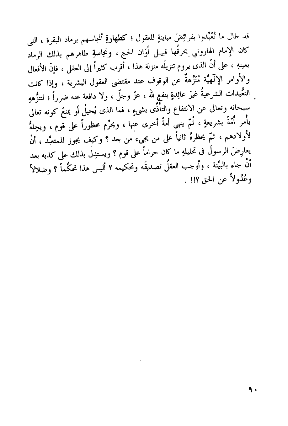 قد طَال مَا تعبدوا بفرائض مباينة للعقول كطهارة أنجاسهم برماد الْبَقَرَة الَّتِي كَانَ الإِمَام الهاروني يحرقها قبيل أَوَان الْحَج ونجاسة طاهرهم بذلك الرماد بِعَيْنِه على أَن الَّذِي يروم تَنْزِيله منزلَة هذاأقرب كثيرا إِلَى الْعقل فَإِن الْأَفْعَال والأوامر الإلهية منزهة عَن الْوُقُوف عِنْد مُقْتَضى الْعُقُول البشرية وَإِذا كَانَت التعبدات الشَّرْعِيَّة غير عَائِدَة بنفع لله عز وَجل وَلَا دافعة عَنهُ ضَرَرا لتنزهه سُبْحَانَهُ وَتَعَالَى عَن الِانْتِفَاع والتأذي بِشَيْء فَمَا الَّذِي يحِيل أَو يمْنَع كَونه تَعَالَى يَأْمر أمة بشريعة ثمَّ ينْهَى أمة أُخْرَى عَنْهَا وَيحرم مَحْظُورًا على قوم ويحلة لأولادهم ثمَّ يحظره ثَانِيًا على من يَجِيء من بعد وَكَيف يجوز للمتعبد أَن يُعَارض الرَّسُول فِي تَحْلِيله مَا كَانَ حَرَامًا على قوم ويستدل بذلك على كذبه بعد أَن جَاءَ بِالْبَيِّنَةِ وَأوجب الْعقل تَصْدِيقه وتحكيمه أَلَيْسَ هَذَا تحكما وضلالا وعدولا عَن الْحق