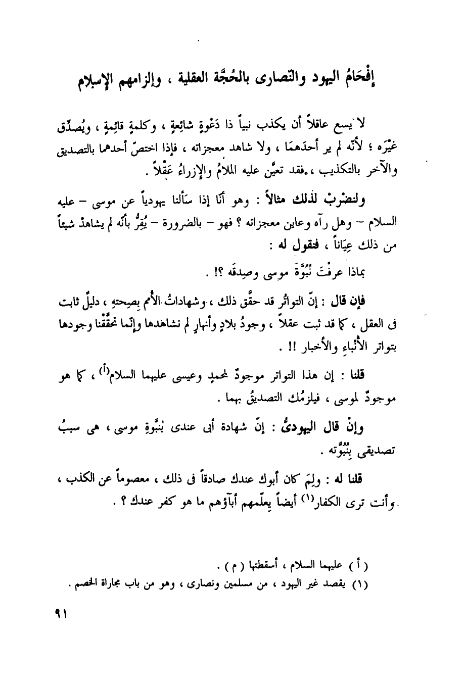 إفحام الْيَهُود وَالنَّصَارَى بِالْحجَّةِ الْعَقْلِيَّة وإلزامهم الْإِسْلَام