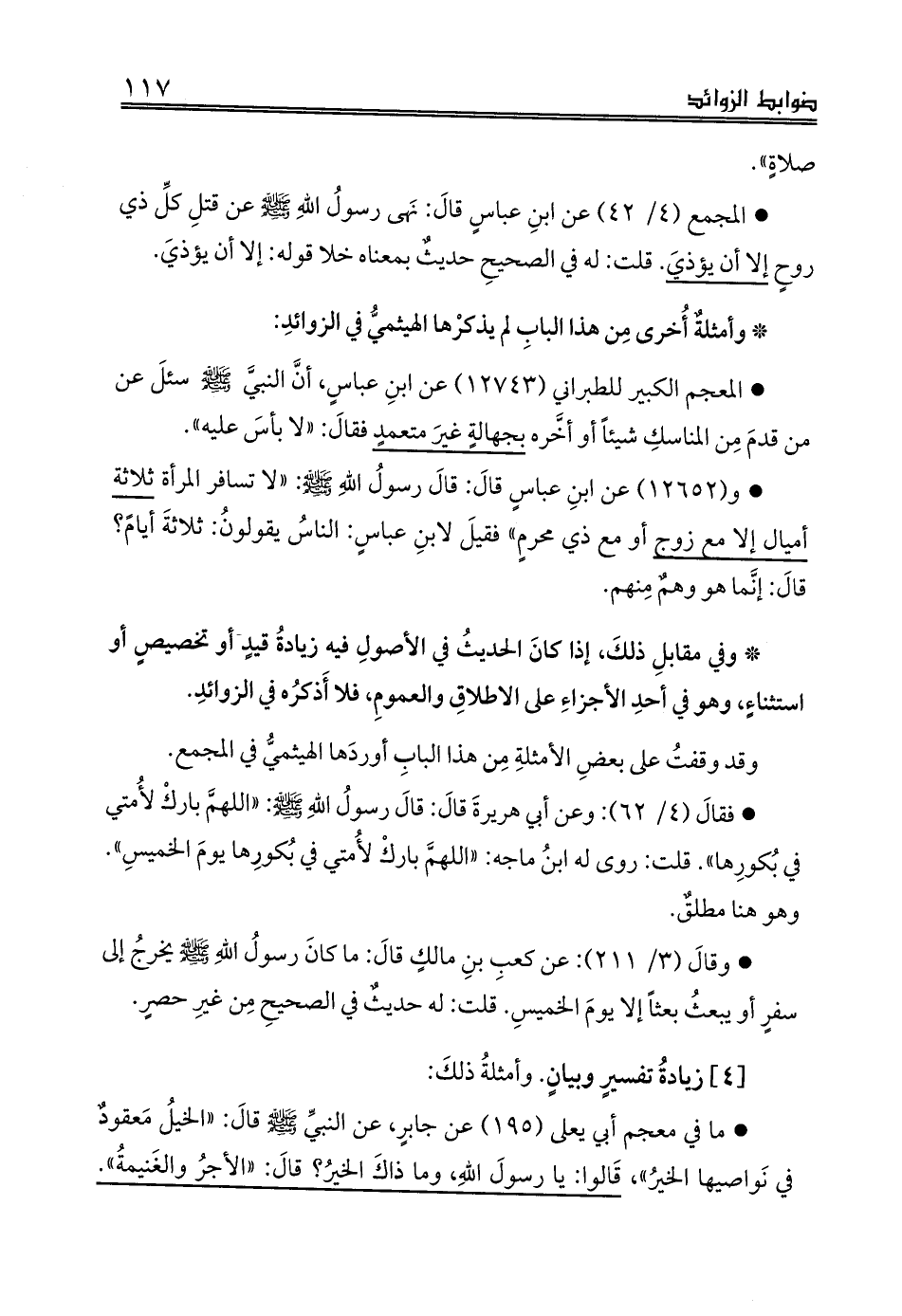 * وفي مقابلِ ذلكَ، إذا كانَ الحديثُ في الأصولِ فيه زيادةُ قيدٍ أو تخصيصٍ أو استثناءٍ، وهو في أحدِ الأجزاءِ على الاطلاقِ والعمومِ، فلا أَذكرُه في الزوائدِ.