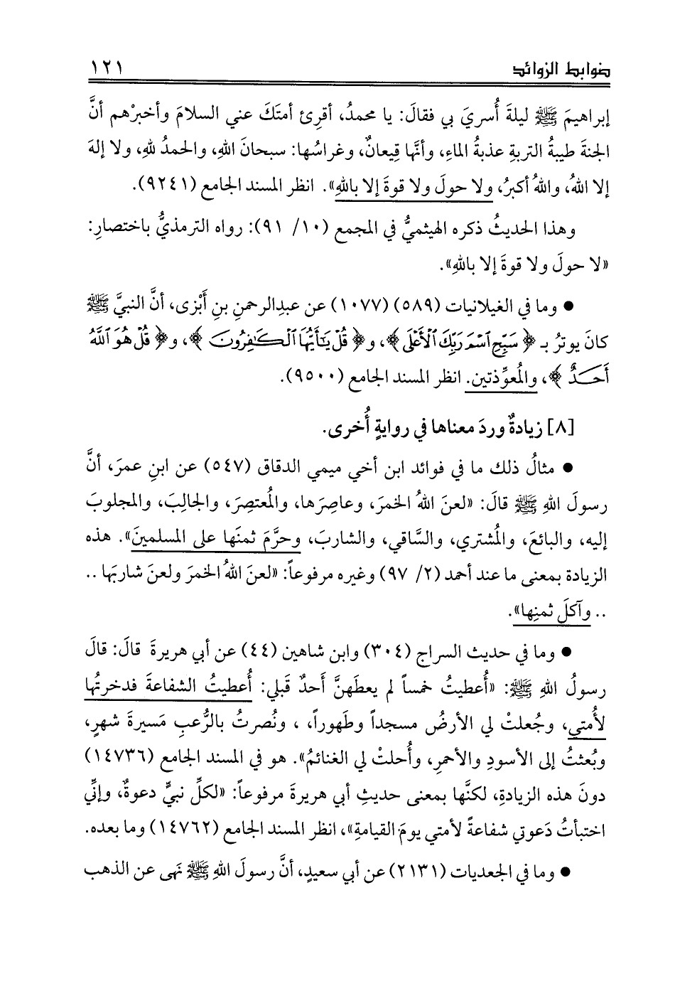 * مثالُ ذلك ما في فوائد ابن أخي ميمي الدقاق (547) عن ابنِ عمرَ، أنَّ رسولَ اللهِ - صلى الله عليه وسلم - قالَ: «لعنَ اللهُ الخمرَ، وعاصِرَها، والمُعتصِرَ، والجالِبَ، والمجلوبَ إليه، والبائعَ، والمُشتري، والسَّاقي، والشاربَ، وحرَّمَ ثمنَها على المسلمينَ». هذه الزيادة بمعنى ما عند أحمد (2/ 97) وغيره مرفوعاً: «لعنَ اللهُ الخمرَ ولعنَ شاربَها .. .. وآكلَ ثمنِها».