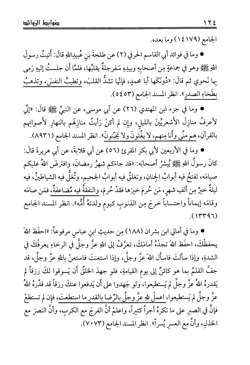 * وما في أمالي ابن بشران (188) مِن حديثِ ابنِ عباسٍ مرفوعاً: «احفَظ اللهَ يحفظْكَ، احفَظ اللهَ تجدْهُ أمامَكَ، تعرَّفْ إلى اللهِ عزَّ وجلَّ في الرخاءِ يعرفْكَ في الشدةِ، وإذا سألتَ فاسأَل اللهَ عزَّ وجلَّ، وإذا استعنتَ فاستعنْ باللهِ عزَّ وجلَّ، قد جفَّ القلمُ بما هو كائنٌ إلى يومِ القيامةِ، فلو جهدَ الخلقُ أَن يَسوقوا لكَ رزقاً لم يَقدرهُ اللهُ عزَّ وجلَّ لم يَستطيعوا، ولو جَهدوا على أَن يَدفعوا عنكَ رزقاً قد قدَّرهُ اللهُ عزَّ وجلَّ لم يَستطيعوا، اعملْ للهِ عزَّ وجلَّ بالرِّضا بالقدرِ ما استطعتَ، فإِن لم تستطعْ فإنَّ في الصبرِ على ما تكرهُ أجراً كثيراً، واعلمْ أنَّ الفرجَ مع الكربِ، وأنَّ النصرَ مع الخذلِ، وأنَّ مع العسرِ يُسراً». انظر المسند الجامع (7073).