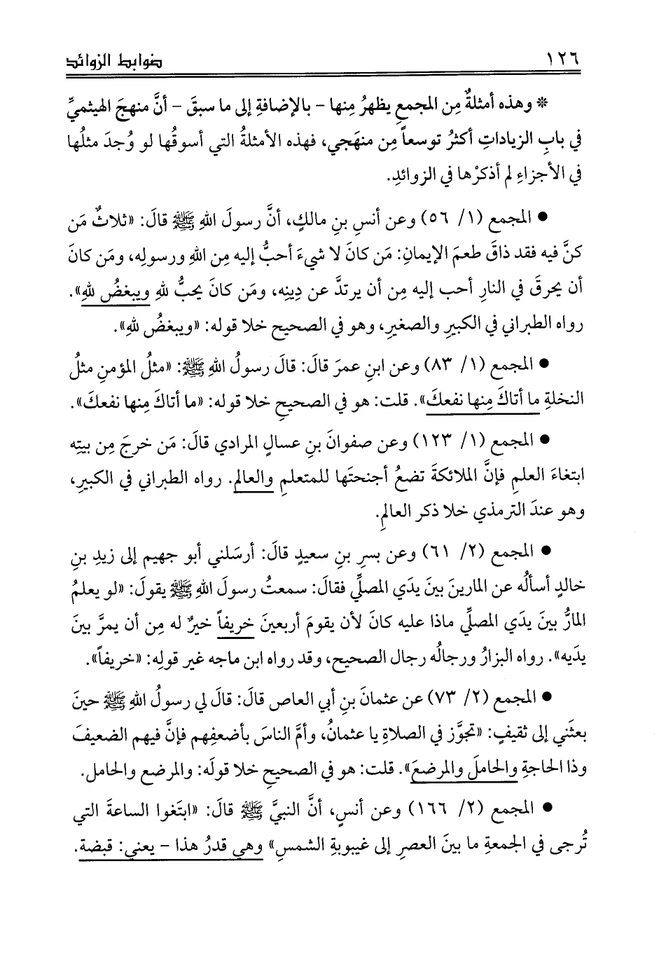 * وهذه أمثلةٌ مِن المجمعِ يظهرُ مِنها - بالإضافةِ إلى ما سبقَ - أنَّ منهجَ الهيثميِّ في بابِ الزياداتِ أكثرُ توسعاً مِن منهَجي، فهذه الأمثلةُ التي أسوقُها لو وُجدَ مثلُها في الأجزاءِ لم أذكرْها في الزوائدِ.