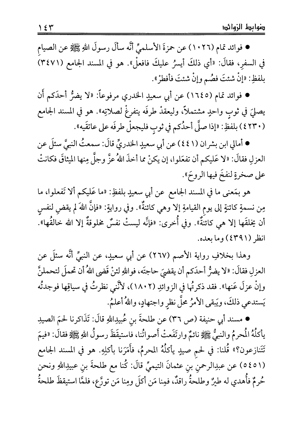 * فوائد تمام (1645) عن أبي سعيدٍ الخدري مرفوعاً: «لا يضرُّ أحدَكم أَن يصليَ في ثوبٍ واحدٍ مشتملاً، وليعقدْ طرفَه يتفرغْ لصلاتِه». هو في المسند الجامع (4230) بلفظِ: «إذا صلَّى أحدُكم في ثوبٍ فليجعلْ طرفَه على عاتقَيه».