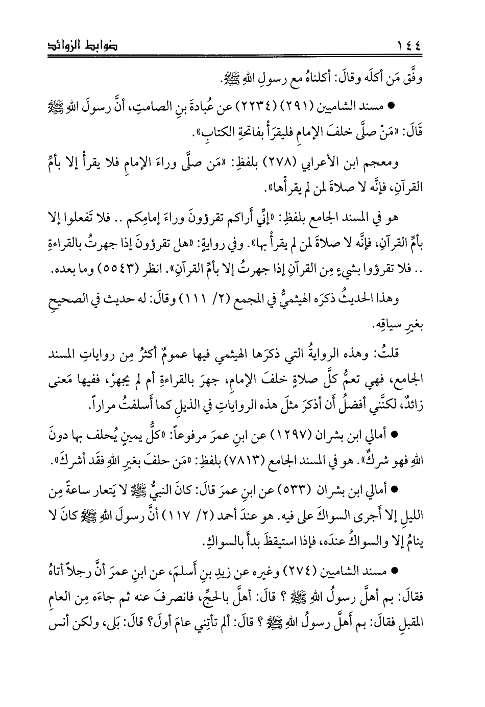 قلتُ: وهذه الروايةُ التي ذكرَها الهيثمي فيها عمومٌ أكثرُ مِن رواياتِ المسند الجامع، فهي تعمُّ كلَّ صلاةٍ خلفَ الإمامِ، جهرَ بالقراءةِ أم لم يجهرْ، ففيها مَعنى زائدٌ، لكنَّني أفضلُ أَن أذكرَ مثلَ هذه الرواياتِ في الذيلِ كما أَسلفتُ مراراً.