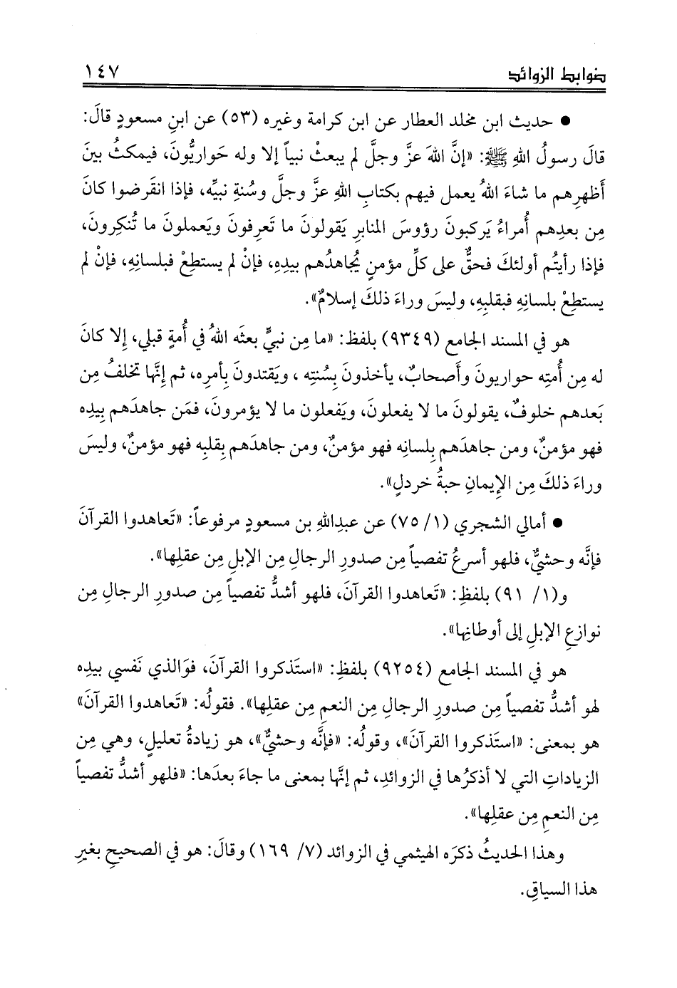 و (1/ 91) بلفظِ: «تَعاهدوا القرآنَ، فلهو أشدُّ تفصياً مِن صدورِ الرجالِ مِن نوازعِ الإبلِ إلى أوطانِها».