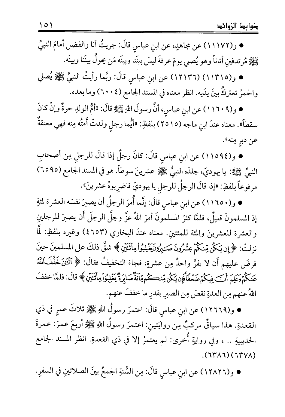 * و (12669) عن ابنِ عباسٍ قالَ: اعتمرَ رسولُ اللهِ - صلى الله عليه وسلم - ثلاثَ عمرٍ في ذي القعدةِ. هذا سياقٌ مركبٌ مِن روايَتينِ: اعتمرَ رسولُ اللهِ - صلى الله عليه وسلم - أربعَ عمرَ: عمرةَ الحديبيةِ .. ، وفي روايةٍ أُخرى: لم يعتمرْ إلا في ذي القعدةِ. انظر المسند الجامع (6378) (6386).