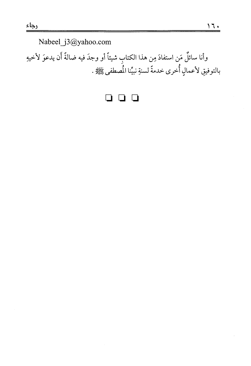 وأنا سائلٌ مَن استفادَ مِن هذا الكتابِ شيئاً أو وجدَ فيه ضالةً أَن يدعوَ لأخيهِ بالتوفيقِ لأعمالٍ أُخرى خدمةً لسنةِ نبيِّنا المُصطفى - صلى الله عليه وسلم -.
