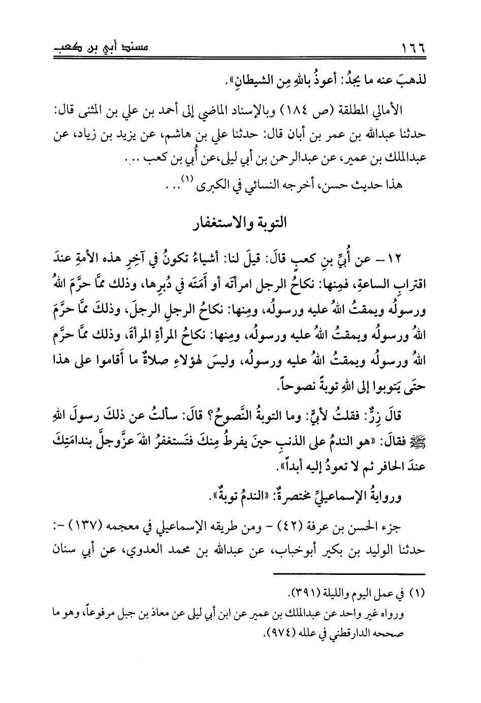 الأمالي المطلقة (ص 184) وبالإسناد الماضي إلى أحمد بن علي بن المثنى قال: حدثنا عبدالله بن عمر بن أبان قال: حدثنا علي بن هاشم، عن يزيد بن زياد، عن عبدالملك بن عمير، عن عبدالرحمن بن أبي ليلى، عن أُبي بن كعب .. .