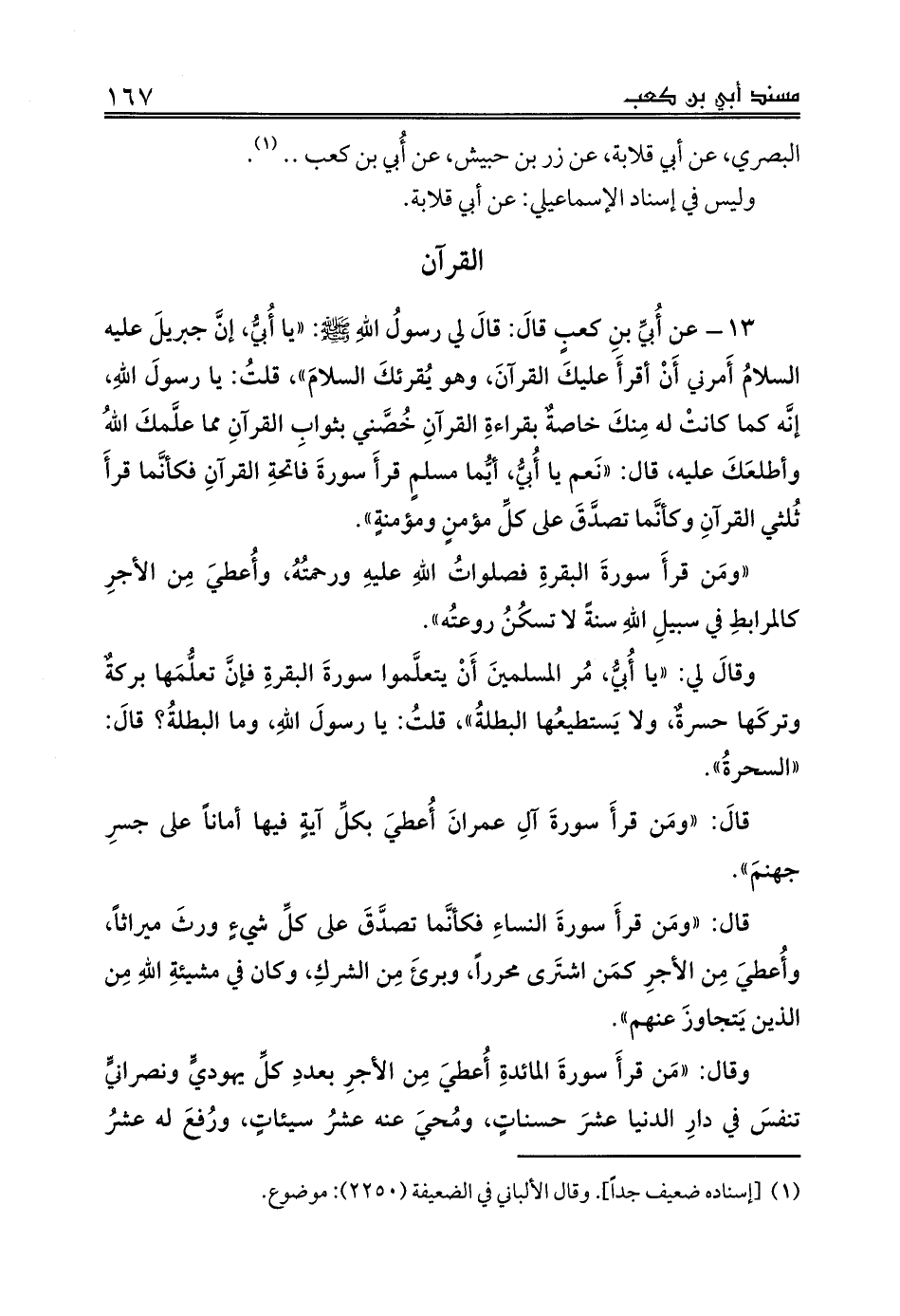 13 - عن أُبيِّ بنِ كعبٍ قالَ: قالَ لي رسولُ اللهِ صلى الله عليه وسلم: «يا أُبيُّ، إنَّ جبريلَ عليه السلامُ أَمرني أَنْ أقرأَ عليكَ القرآنَ، وهو يُقرئكَ السلامَ»، قلتُ: يا رسولَ اللهِ، إنَّه كما كانتْ له مِنكَ خاصةٌ بقراءةِ القرآنِ خُصَّني بثوابِ القرآنِ مما علَّمكَ اللهُ وأطلعَكَ عليه، قال: «نَعم يا أُبيُّ، أيُّما مسلمٍ قرأَ سورةَ فاتحةِ القرآنِ فكأنَّما قرأَ ثُلثي القرآنِ وكأنَّما تصدَّقَ على كلِّ مؤمنٍ ومؤمنةٍ».