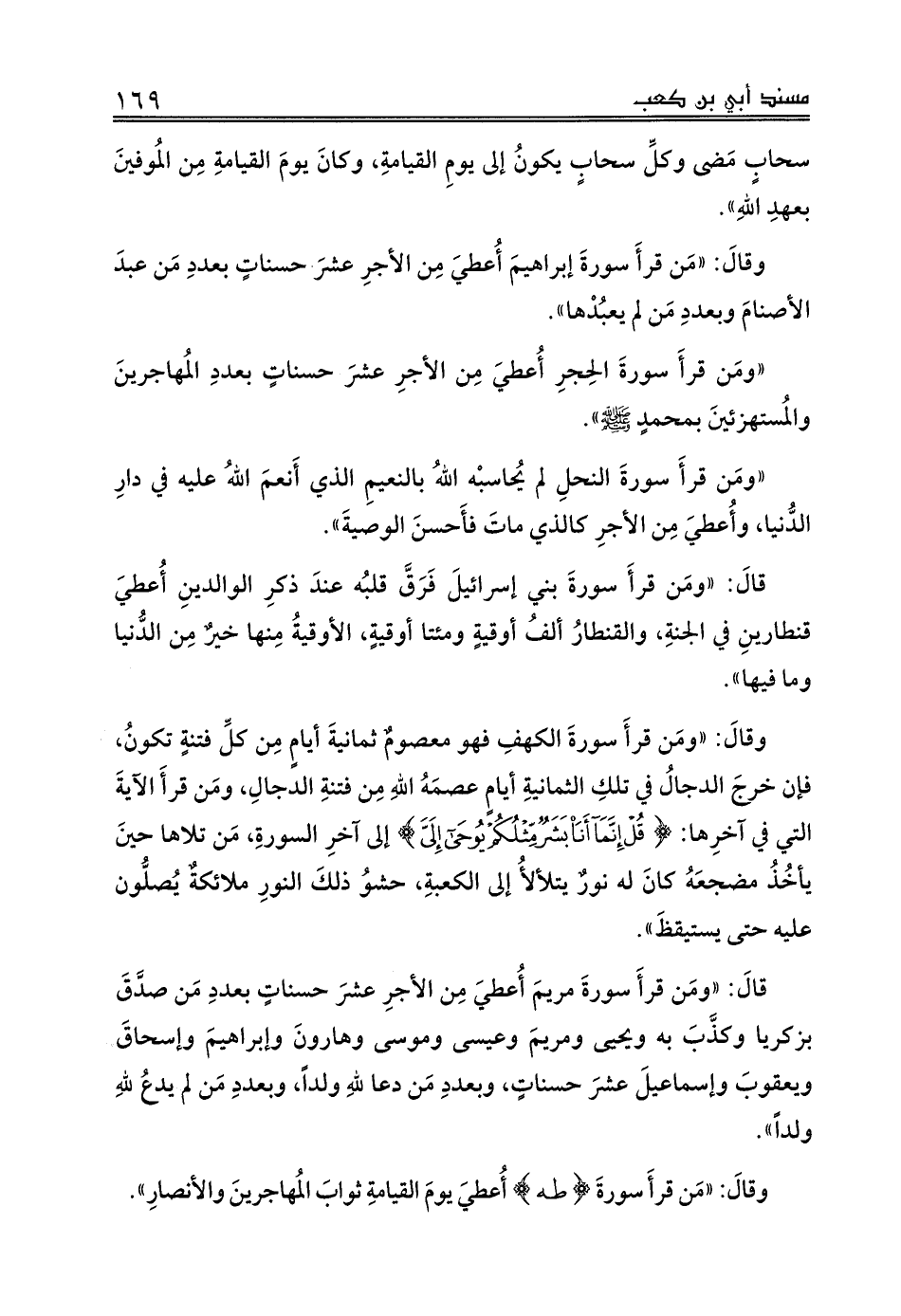 قالَ: «ومَن قرأَ سورةَ مريمَ أُعطيَ مِن الأجرِ عشرَ حسناتٍ بعددِ مَن صدَّقَ بزكريا وكذَّبَ به ويحيى ومريمَ وعيسى وموسى وهارونَ وإبراهيمَ وإسحاقَ ويعقوبَ وإسماعيلَ عشرَ حسناتٍ، وبعددِ مَن دعا للهِ ولداً وبعددِ مَن لم يدعُ للهِ ولداً».