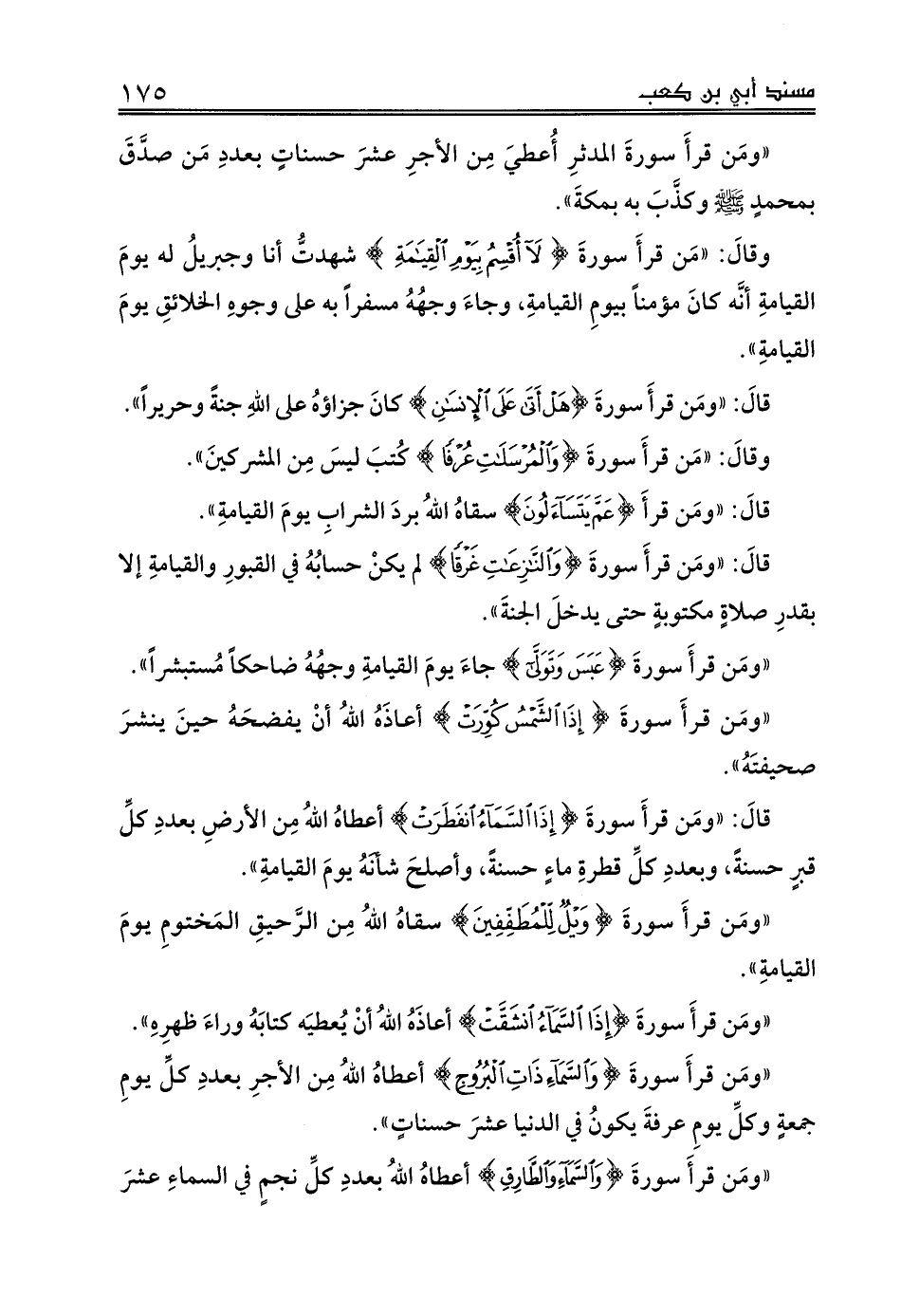 قالَ: «ومَن قرأَ سورةَ {وَالنَّازِعَاتِ غَرْقًا} لم يكنْ حسابُهُ في القبورِ والقيامةِ إلا بقدرِ صلاةٍ مكتوبةٍ حتى يدخلَ الجنةَ».