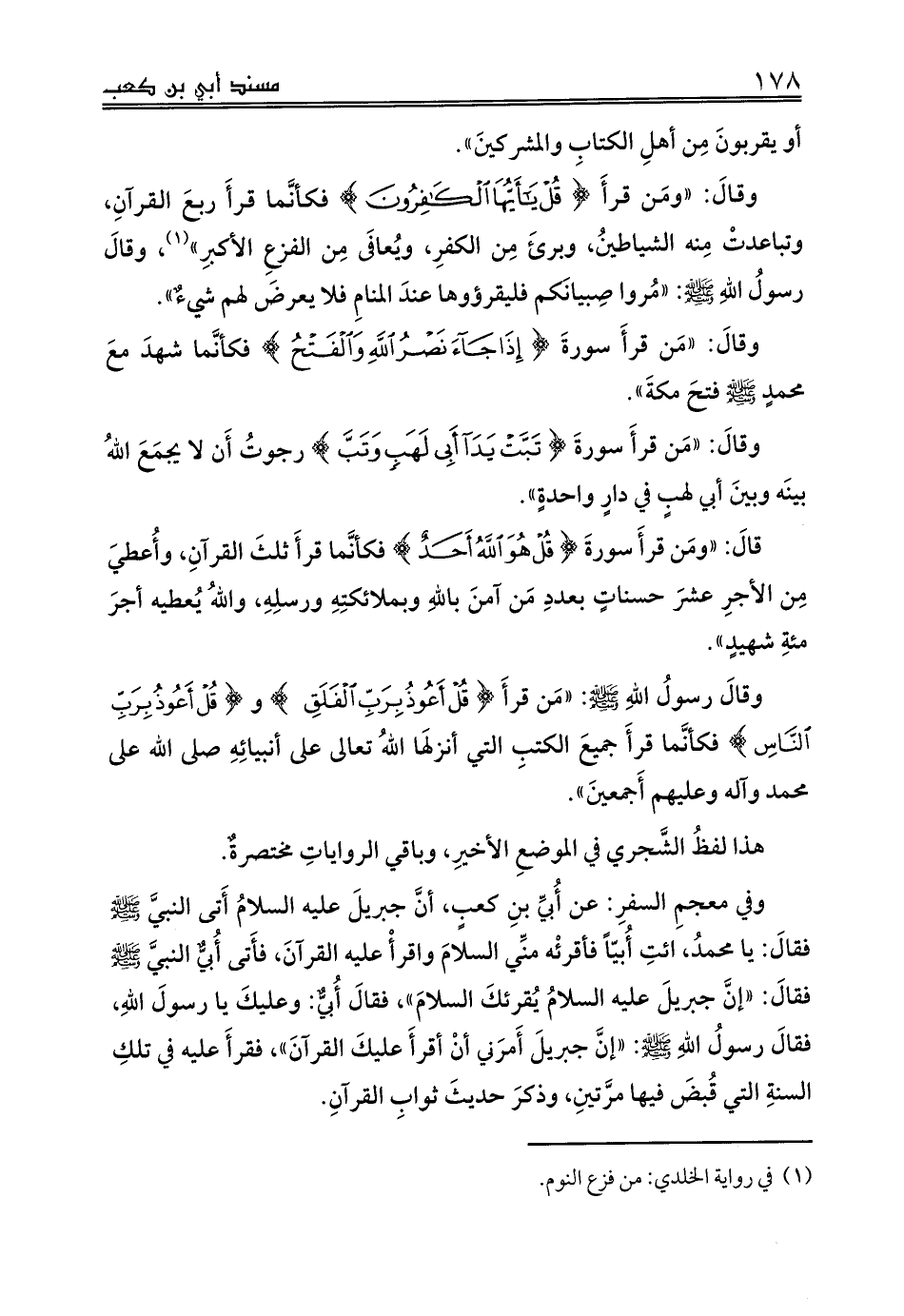 وفي معجمِ السفرِ: عن أُبيِّ بنِ كعبٍ، أنَّ جبريلَ عليه السلامُ أَتى النبيَّ صلى الله عليه وسلم فقالَ: يا محمدُ، ائتِ أُبيّاً فأقرئْه منيِّ السلامَ واقرأْ عليه القرآنَ، فأَتى أُبيٌّ النبيَّ صلى الله عليه وسلم فقالَ: «إنَّ جبريلَ عليه السلامُ يُقرئكَ السلامَ»، فقالَ أُبيٌّ: وعليكَ يا رسولَ اللهِ، فقالَ رسولُ اللهِ صلى الله عليه وسلم: «إنَّ جبريلَ أَمرَني أنْ أقرأَ عليكَ القرآنَ»، فقرأَ عليه في تلكِ السنةِ التي قُبضَ فيها مرَّتينِ، وذكرَ حديثَ ثوابِ القرآنِ.