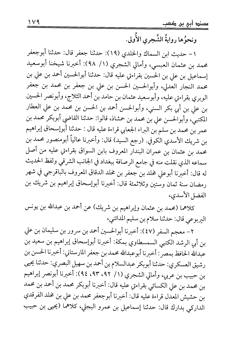 الوبري بقراءتي عليه، وأبوسعيد عثمان بن حامد بن أحمد الثلاج، وأبونصر الحسين بن علي بن أبي بكر السني، وأبوالحسن أحمد بن الحسن بن محمد بن علي العطار المكتبي، وأبوالحسن علي بن محمد بن حمشاذ، قالوا: حدثنا القاضي أبوبكر محمد بن عمر بن محمد بن سلم بن البراء الجعابي قراءة عليه قال: حدثنا أبوإسحاق إبراهيم بن شريك الأسدي الكوفي. (رجع السيد) قال: وأخبرنا عالياً أبومنصور محمد بن محمد بن عثمان بن عمران البندار المعروف بابن السواق بقراءتي عليه من أصل سماعه الذي نقلت منه في جامع الرصافة ببغداد في الجانب الشرقي ولفظ الحديث له قال: أخبرنا أبوعلي مخلد بن جعفر بن مخلد الدقاق المعروف بالباقرجي في شهر رمضان سنة ثمان وستين وثلاثمئة قال: أخبرنا أبوإسحاق إبراهيم بن شريك بن الفضل الأسدي،