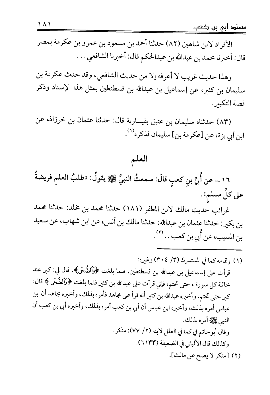 16 - عن أُبيِّ بنِ كعبٍ قالَ: سمعتُ النبيَّ صلى الله عليه وسلم يقولُ: «طلبُ العلمِ فريضةٌ على كلِّ مسلمٍ».