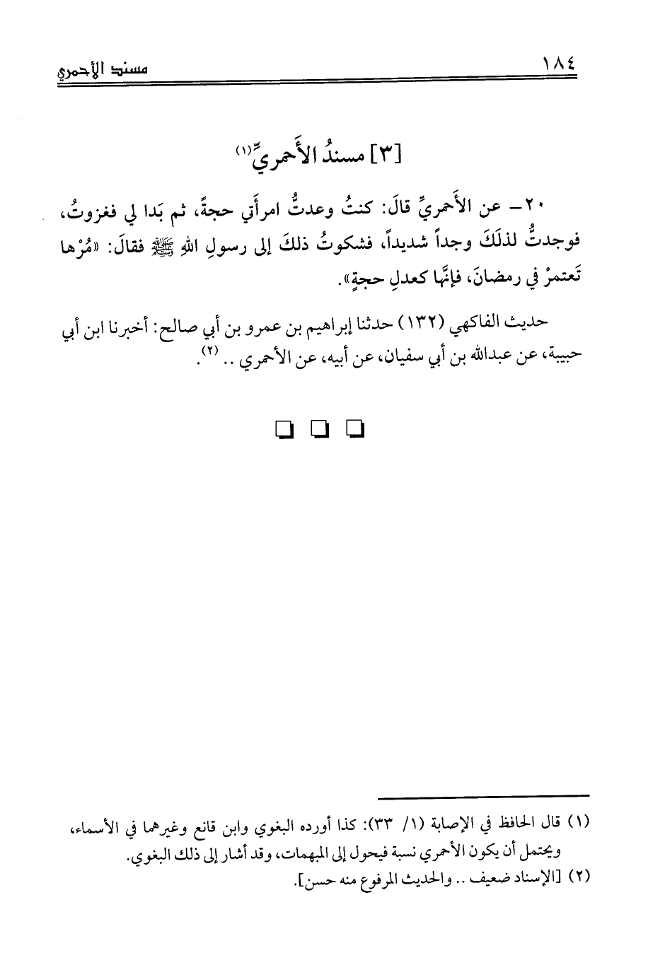 20 - عن الأَحمريِّ قالَ: كنتُ وعدتُّ امرأَتي حجةً، ثم بَدا لي فغزوتُ، فوجدتُّ لذلَكَ وجداً شديداً، فشكوتُ ذلكَ إلى رسولِ اللهِ صلى الله عليه وسلم فقالَ: «مُرْها تَعتمرْ في رمضانَ، فإنَّها كعدلِ حجةٍ».