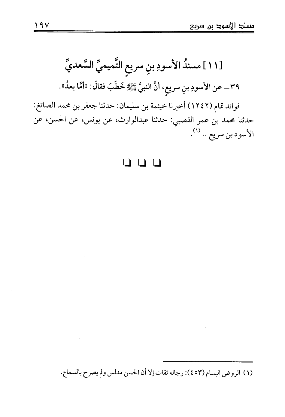 39 - عن الأسودِ بنِ سريعٍ، أنَّ النبيَّ صلى الله عليه وسلم خَطَبَ فقالَ: «أمَّا بعدُ».