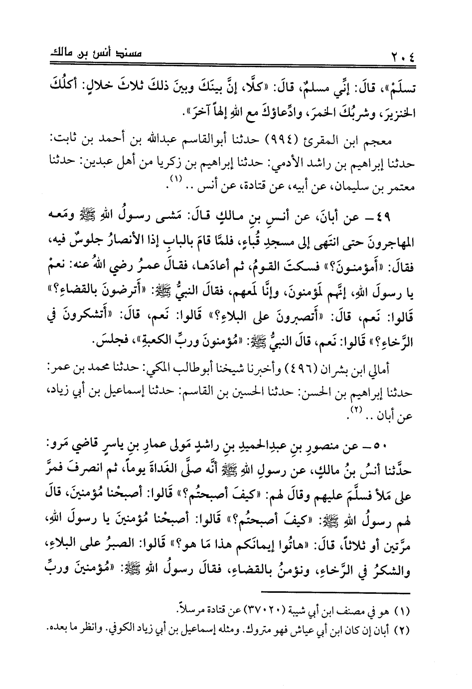 49 - عن أبانَ، عن أنسِ بنِ مالكٍ قالَ: مَشى رسولُ اللهِ صلى الله عليه وسلم ومَعه المهاجرونَ حتى انتَهى إلى مسجدِ قُباءٍ، فلمَّا قامَ بالبابِ إذا الأنصارُ جلوسٌ فيه، فقالَ: «أَمؤمنونَ؟» فسكتَ القومُ، ثم أعادَها، فقالَ عمرُ رضي اللهُ عنه: نعمْ يا رسولَ اللهِ، إنَّهم لَمؤمنونَ، وإنَّا لَمعهم، فقالَ النبيُّ صلى الله عليه وسلم: «أَترضونَ بالقضاءِ؟» قَالوا: نَعم، قالَ: «أَتصبرونَ على البلاءِ؟» قَالوا: نَعم، قالَ: «أَتشكرونَ في الرَّخاءِ؟» قَالوا: نَعم، قالَ النبيُّ صلى الله عليه وسلم: «مُؤمنونَ وربِّ الكعبةِ»، فجلسَ.