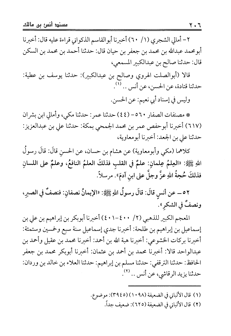 المعجم الكبير للذهبي (2/ 400 - 401) أخبرنا أبوبكر بن إبراهيم بن علي بن إسماعيل بن إبراهيم بن طلحة: أخبرنا جدي إسماعيل سنة سبع وخمسين وستمئة: أخبرنا بركات الخشوعي: أخبرنا هبة الله بن أحمد: أخبرنا محمد بن عقيل وأحمد بن عبدالواحد قالا: أخبرنا محمد بن أحمد بن عثمان: أخبرنا أبوبكر محمد بن جعفر الحافظ: حدثنا الترقفي: حدثنا مسلم بن إبراهيم: حدثنا العلاء بن خالد بن وردان: حدثنا يزيد الرقاشي، عن أنس .. (¬2).