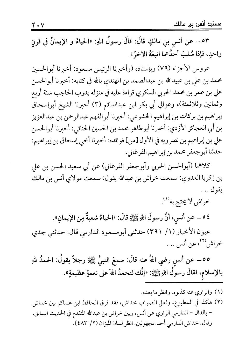 كلاهما (أبوالحسن الحربي وأبوجعفر الفرغاني) عن أبي سعيد الحسن بن علي بن زكريا العدوي: سمعت خراش بن عبد الله يقول: سمعت مولاي أنس بن مالك يقول ...