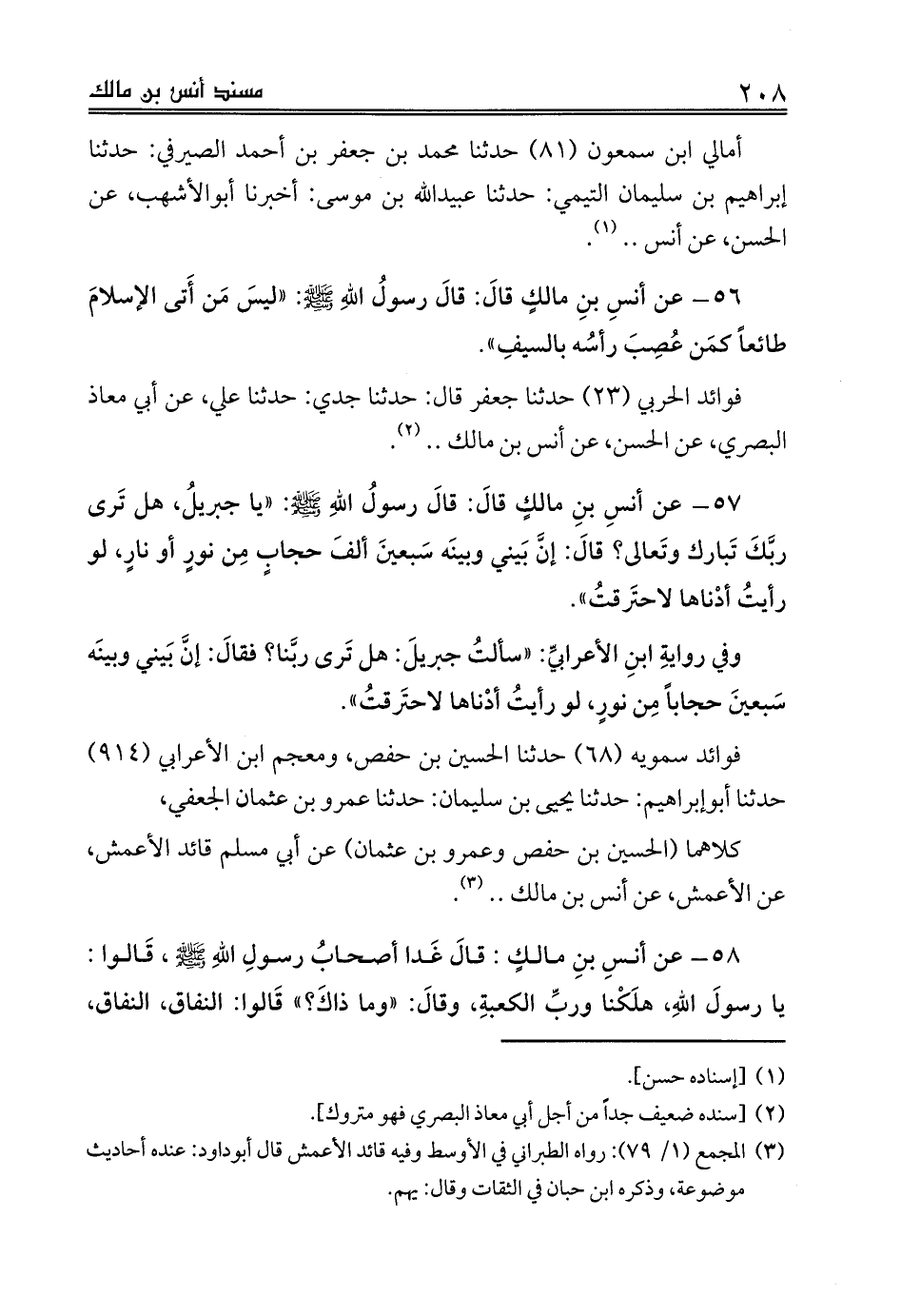 أمالي ابن سمعون (81) حدثنا محمد بن جعفر بن أحمد الصيرفي: حدثنا إبراهيم بن سليمان التيمي: حدثنا عبيدالله بن موسى: أخبرنا أبوالأشهب، عن الحسن، عن أنس .. (¬1).