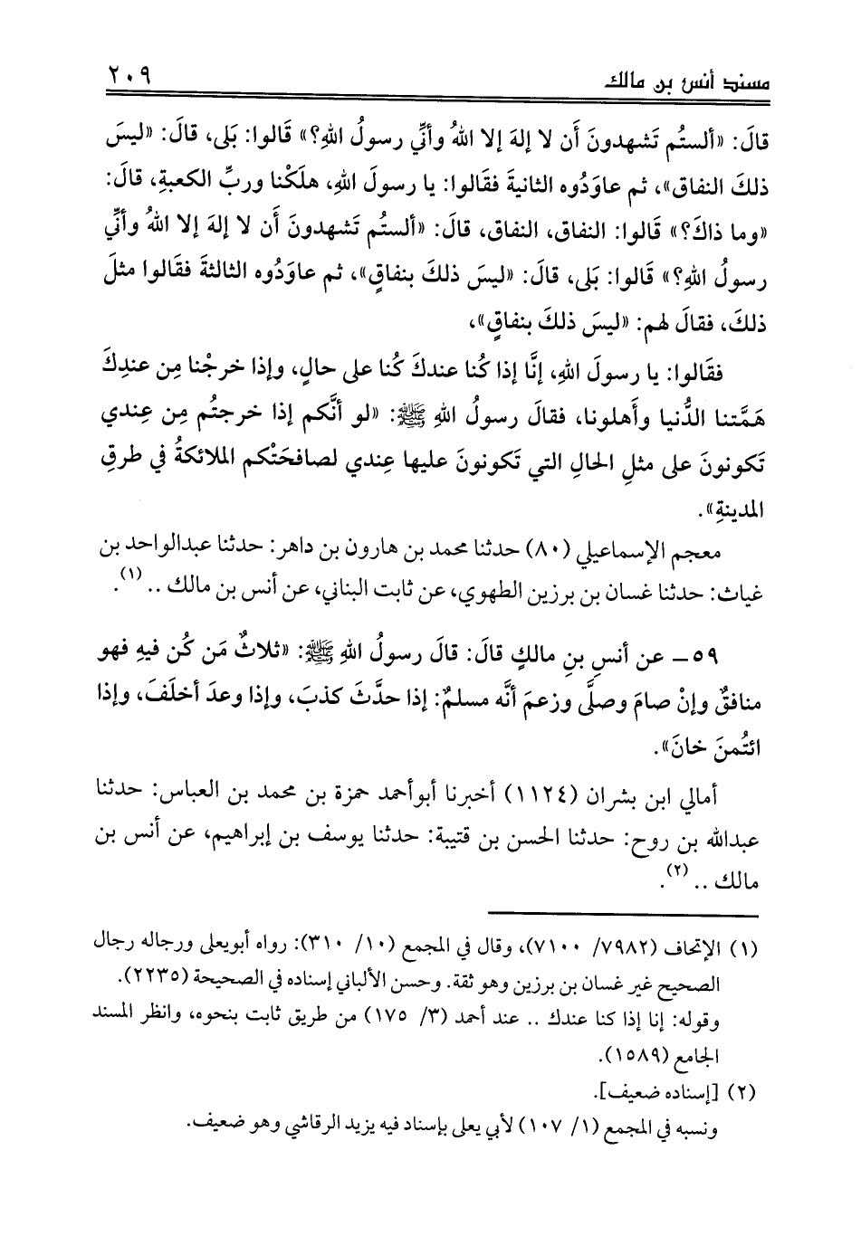 59 - عن أنسِ بنِ مالكٍ قالَ: قالَ رسولُ اللهِ صلى الله عليه وسلم: «ثلاثٌ مَن كُن فيهِ فهو منافقٌ وإنْ صامَ وصلَّى وزعمَ أنَّه مسلمٌ: إذا حدَّثَ كذبَ، وإذا وعدَ أخلَفَ، وإذا ائتُمنَ خانَ».