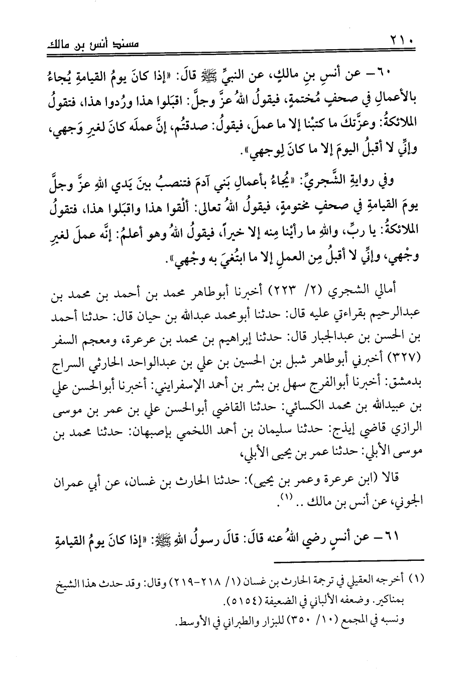 60 - عن أنسِ بنِ مالكٍ، عن النبيِّ صلى الله عليه وسلم قالَ: «إذا كانَ يومُ القيامةِ يُجاءُ بالأعمالِ في صحفٍ مُختمةٍ، فيقولُ اللهُ عزَّ وجلَّ: اقبَلوا هذا ورُدوا هذا، فتقولُ الملائكةُ: وعزَّتكَ ما كتبْنا إلا ما عملَ، فيقولُ: صدقتُم، إنَّ عملَه كانَ لغيرِ وَجهي، وإنِّي لا أقبلُ اليومَ إلا ما كانَ لِوجهي».