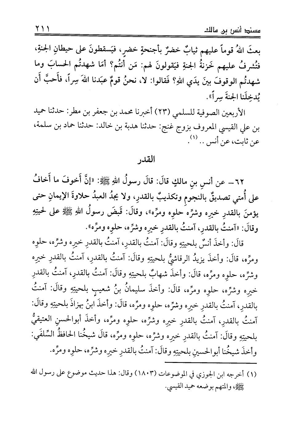 62 - عن أنسِ بنِ مالكٍ قالَ: قالَ رسولُ اللهِ صلى الله عليه وسلم: «إنَّ أَخوفَ ما أَخافُ على أُمتي تصديقٌ بالنجومِ وتكذيبٌ بالقدرِ، ولا يجدُ العبدُ حلاوةَ الإيمانِ حتى يؤمنَ بالقدرِ خيرِه وشرِّه حلوِه ومرِّه»، وقالَ: قَبضَ رسولُ اللهِ صلى الله عليه وسلم على لحيتِهِ وقالَ: «آمنتُ بالقدرِ، آمنتُ بالقدرِ خيرِه وشرِّه، حلوِه ومرِّه».