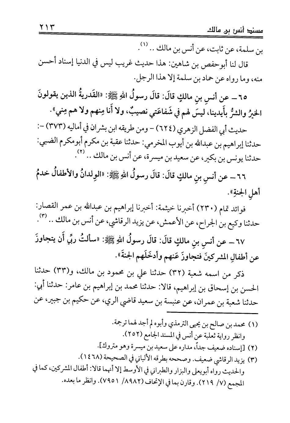 66 - عن أنسِ بنِ مالكٍ قالَ: قالَ رسولُ اللهِ صلى الله عليه وسلم: «الوِلدانُ والأطفالُ خدمُ أهلِ الجنةِ».