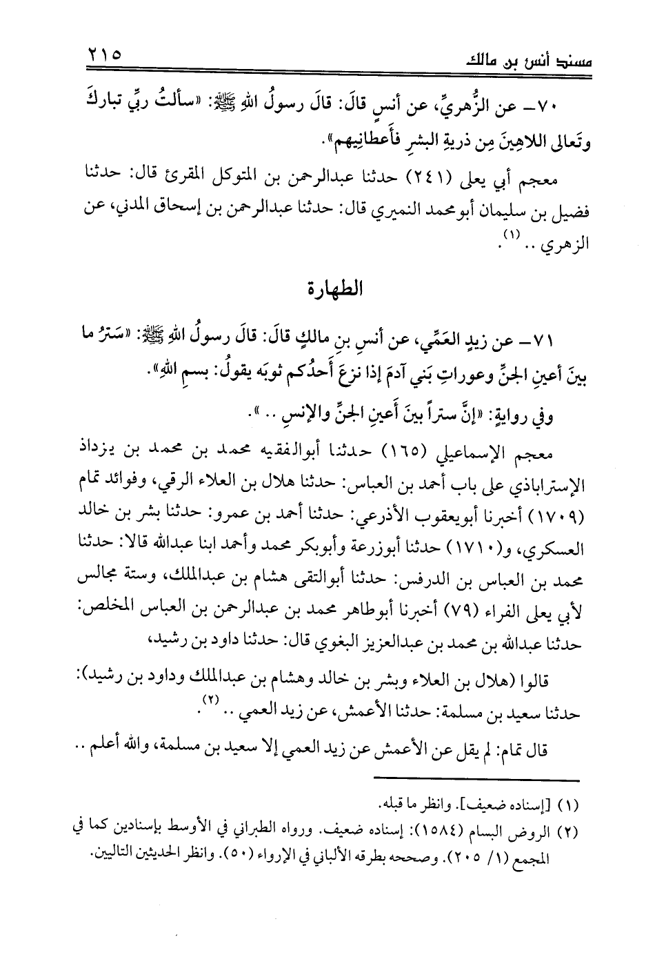 71 - عن زيدٍ العَمِّي، عن أنسِ بنِ مالكٍ قالَ: قالَ رسولُ اللهِ صلى الله عليه وسلم: «سَترُ ما بينَ أعينِ الجنِّ وعوراتِ بَني آدمَ إذا نزعَ أَحدُكم ثوبَه يقولُ: بسمِ اللهِ».