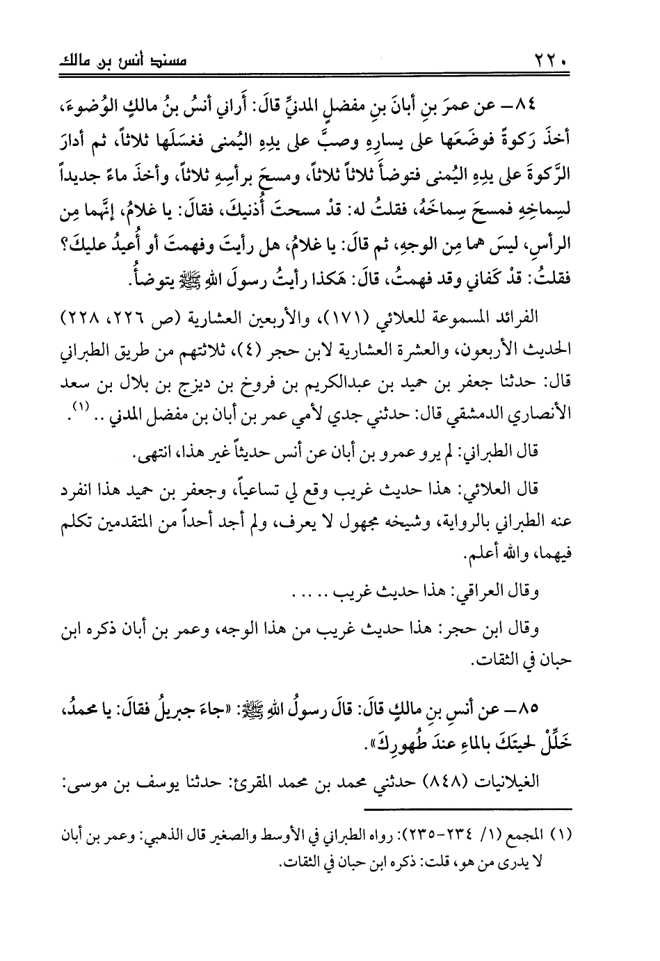84 - عن عمرَ بنِ أبانَ بنِ مفضلٍ المدنيِّ قالَ: أَراني أنسُ بنُ مالكٍ الوُضوءَ، أخذَ رَكوةً فوضَعَها على يسارِهِ وصبَّ على يدِهِ اليُمنى فغسَلَها ثلاثاً، ثم أدارَ الرَّكوةَ على يدِهِ اليُمنى فتوضأَ ثلاثاً ثلاثاً، ومسحَ برأسِهِ ثلاثاً، وأخذَ ماءً جديداً لسِماخِهِ فمسحَ سِماخَهُ، فقلتُ له: قدْ مسحتَ أُذنيكَ، فقالَ: يا غلامُ، إنَّهما مِن الرأسِ، ليسَ هما مِن الوجهِ، ثم قالَ: يا غلامُ، هل رأيتَ وفهمتَ أو أُعيدُ عليكَ؟ فقلتُ: قدْ كَفاني وقد فهمتُ، قالَ: هَكذا رأيتُ رسولَ اللهِ صلى الله عليه وسلم يتوضأُ.
