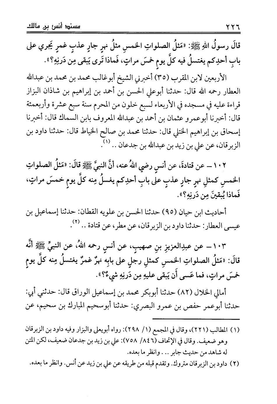 (¬1) المطالب (221)، وقال في المجمع (1/ 298): رواه أبويعلى والبزار وفيه داود بن الزبرقان وهو ضعيف. وقال في الإتحاف (846/ 758): علي بن زيد بن جدعان ضعيف، لكن المتن له شاهد من حديث جابر .. . وانظر ما بعده.