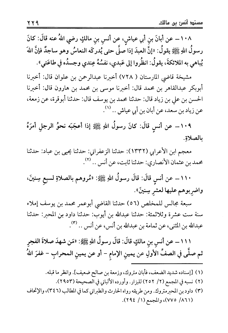 108 - عن أبانَ بنِ أبي عياشٍ، عن أنسِ بنِ مالكٍ رضي اللهُ عنه قالَ: كانَ رسولُ اللهِ صلى الله عليه وسلم يقولُ: «إنَّ العبدَ إذا صلَّى حتى يُدركَه النعاسُ وهو ساجدٌ فإنَّ اللهَ يُباهي به الملائكةَ، يقولُ: انظُروا إلى عَبدي، نفسُهُ عِندي وجسدُه في طاعَتي».