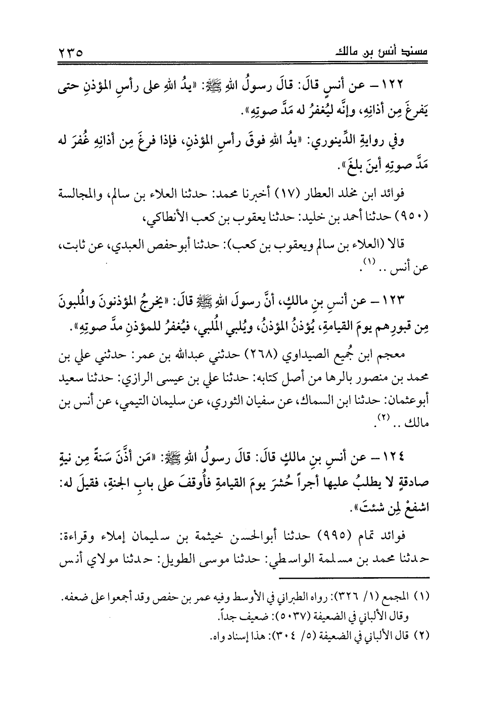122 - عن أنسٍ قالَ: قالَ رسولُ اللهِ صلى الله عليه وسلم: «يدُ اللهِ على رأسِ المؤذنِ حتى يَفرغَ مِن أذانِهِ، وإنَّه ليُغفرُ له مَدَّ صوتِهِ».