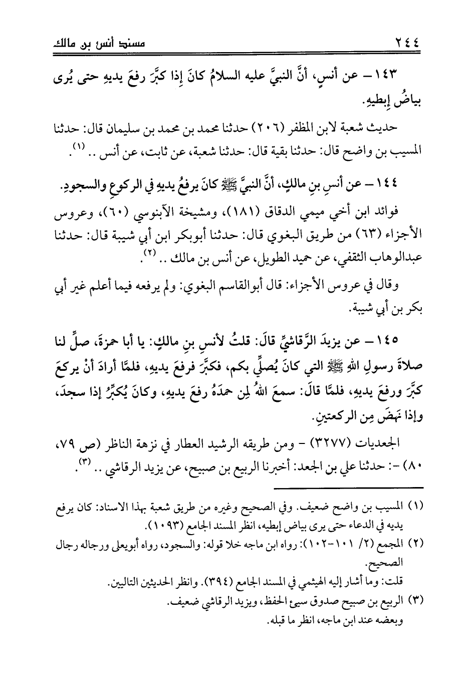 144 - عن أنسِ بنِ مالكٍ، أنَّ النبيَّ صلى الله عليه وسلم كانَ يرفعُ يديهِ في الركوعِ والسجودِ.