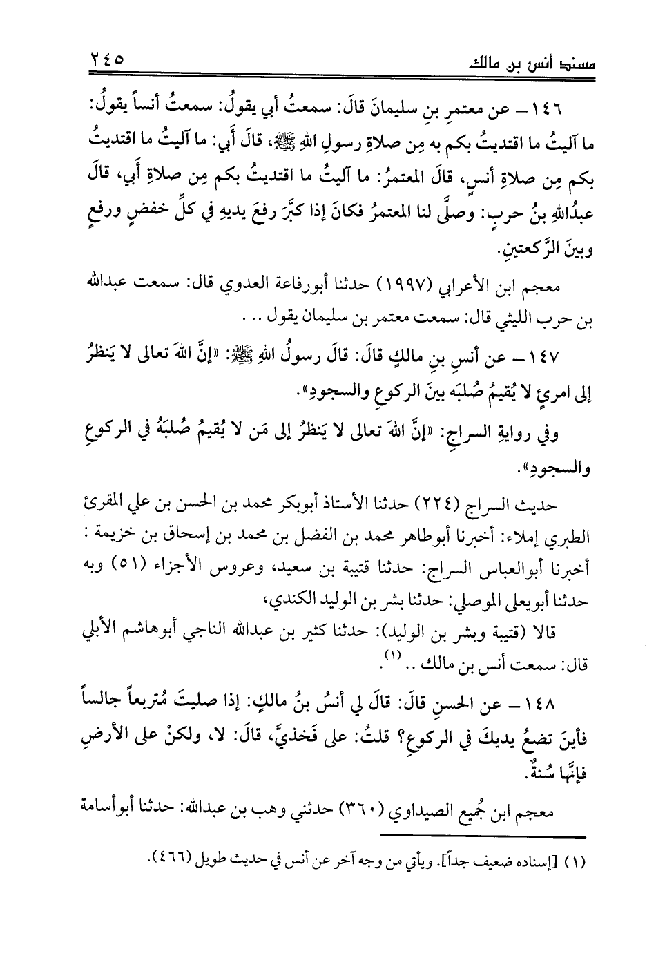 147 - عن أنسِ بنِ مالكٍ قالَ: قالَ رسولُ اللهِ صلى الله عليه وسلم: «إنَّ اللهَ تعالى لا يَنظرُ إلى امرئٍ لا يُقيمُ صُلبَه بينَ الركوعِ والسجودِ».