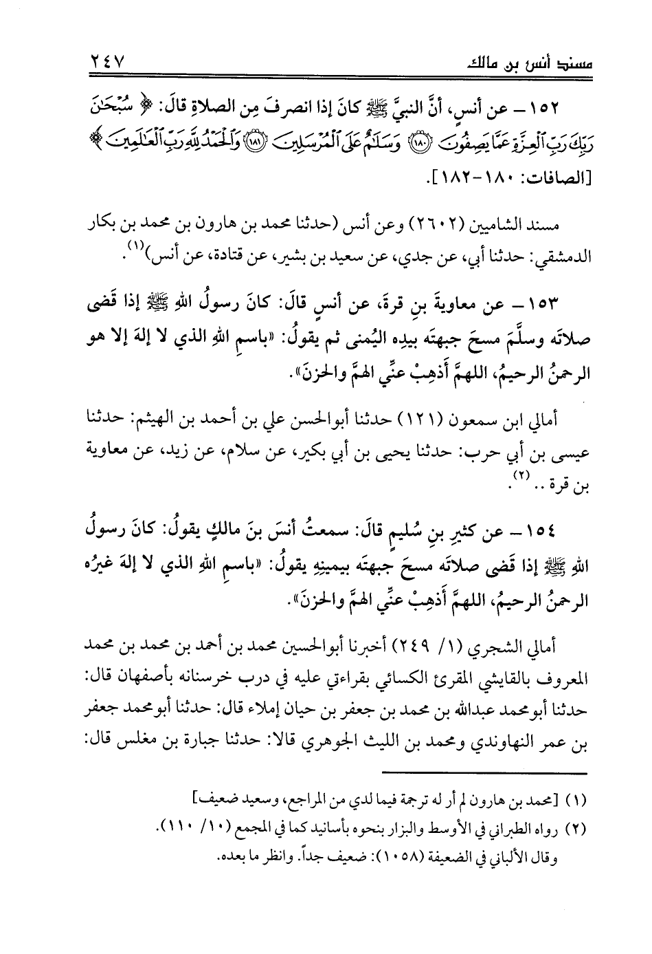 154 - عن كثيرِ بنِ سُليمٍ قالَ: سمعتُ أنسَ بنَ مالكٍ يقولُ: كانَ رسولُ اللهِ صلى الله عليه وسلم إذا قَضى صلاتَه مسحَ جبهتَه بيمينِهِ يقولُ: «باسمِ اللهِ الذي لا إلهَ غيرُه الرحمنُ الرحيمُ، اللهمَّ أَذهِبْ عنِّي الهمَّ والحزنَ».