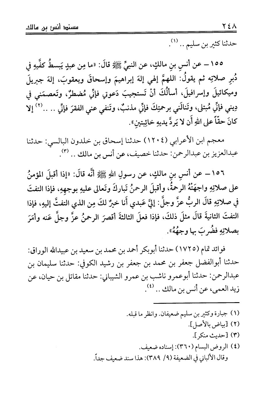(¬4) الروض البسام (360): إسناده ضعيف. وقال الألباني في الضعيفة (9/ 389): هذا سند ضعيف جداً.