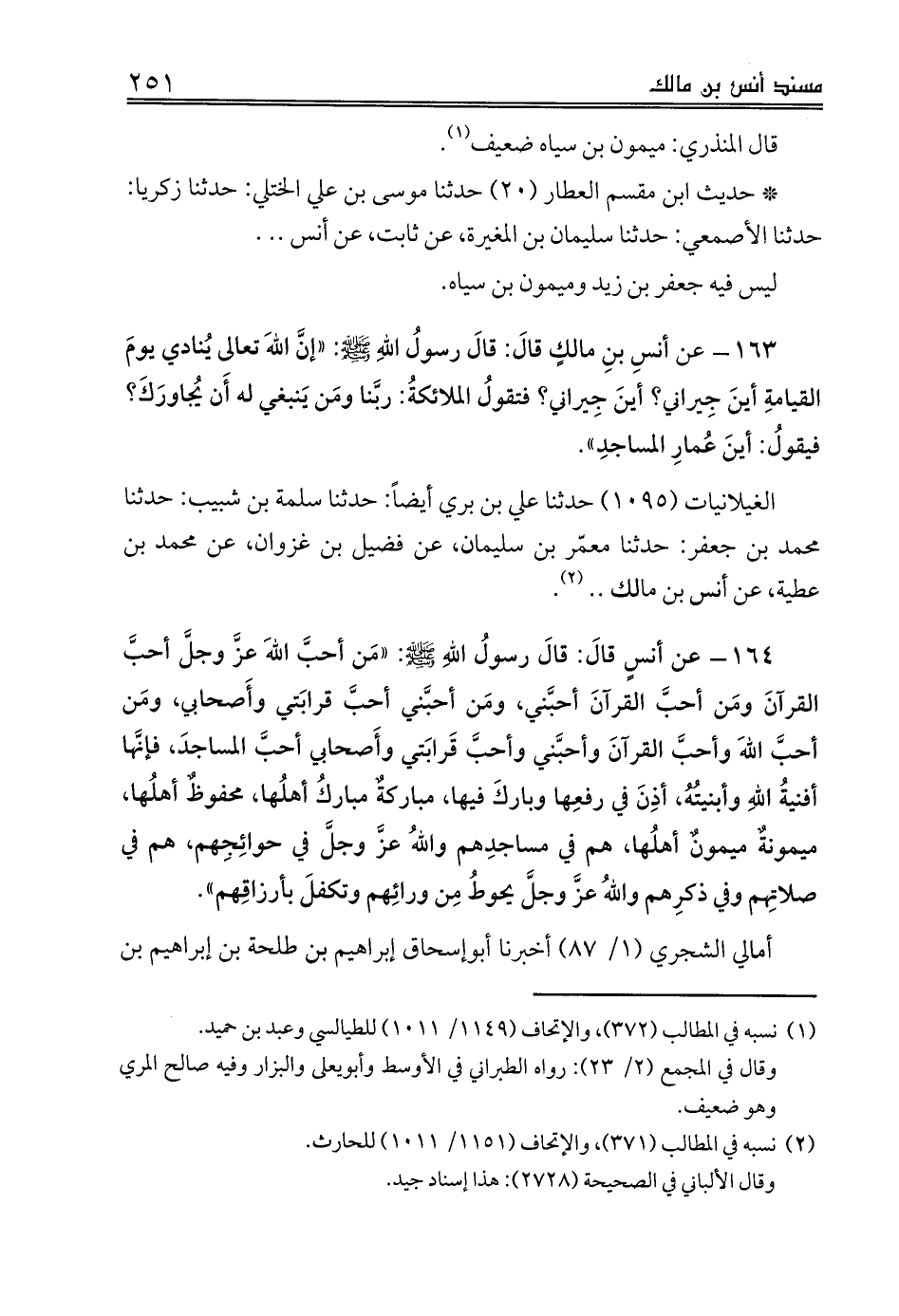164 - عن أنسٍ قالَ: قالَ رسولُ اللهِ صلى الله عليه وسلم: «مَن أحبَّ اللهَ عزَّ وجلَّ أحبَّ القرآنَ ومَن أحبَّ القرآنَ أحبَّني، ومَن أحبَّني أحبَّ قرابَتي وأَصحابي، ومَن أحبَّ اللهَ وأحبَّ القرآنَ وأحبَّني وأحبَّ قَرابَتي وأَصحابي أحبَّ المساجدَ، فإنَّها أفنيةُ اللهِ وأبنيتُهُ، أذِنَ في رفعِها وباركَ فيها، مباركةٌ مباركُ أهلُها، محفوظٌ أهلُها، ميمونةٌ ميمونٌ أهلُها، هم في مساجدِهم واللهُ عزَّ وجلَّ في حوائِجِهم، هم في صلاتِهم وفي ذكرِهم واللهُ عزَّ وجلَّ يحوطُ مِن ورائِهم وتكفلَ بأرزاقِهم».