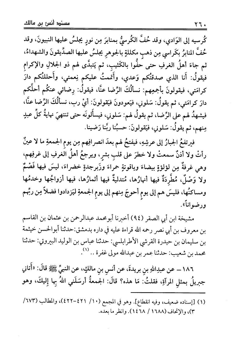 186 - عن عبدِاللهِ بنِ بريدةَ، عن أنسِ بنِ مالكٍ، عن النبيِّ صلى الله عليه وسلم قالَ: «أَتاني جبريلُ بمثلِ المرآةِ، فقلتُ: مَا هذه؟ قالَ: الجمعةُ أرسَلَني اللهُ بِها إِليكَ، وهو