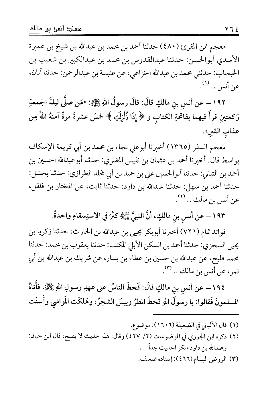 192 - عن أنسِ بنِ مالكٍ قالَ: قالَ رسولُ اللهِ صلى الله عليه وسلم: «مَن صلَّى ليلةَ الجمعةِ رَكعتينِ قرأَ فيهما بفاتحةِ الكتابِ و {إِذَا زُلْزِلَتِ} خمسَ عشرةَ مرةً آمنهُ اللهُ مِن عذابِ القبرِ».
