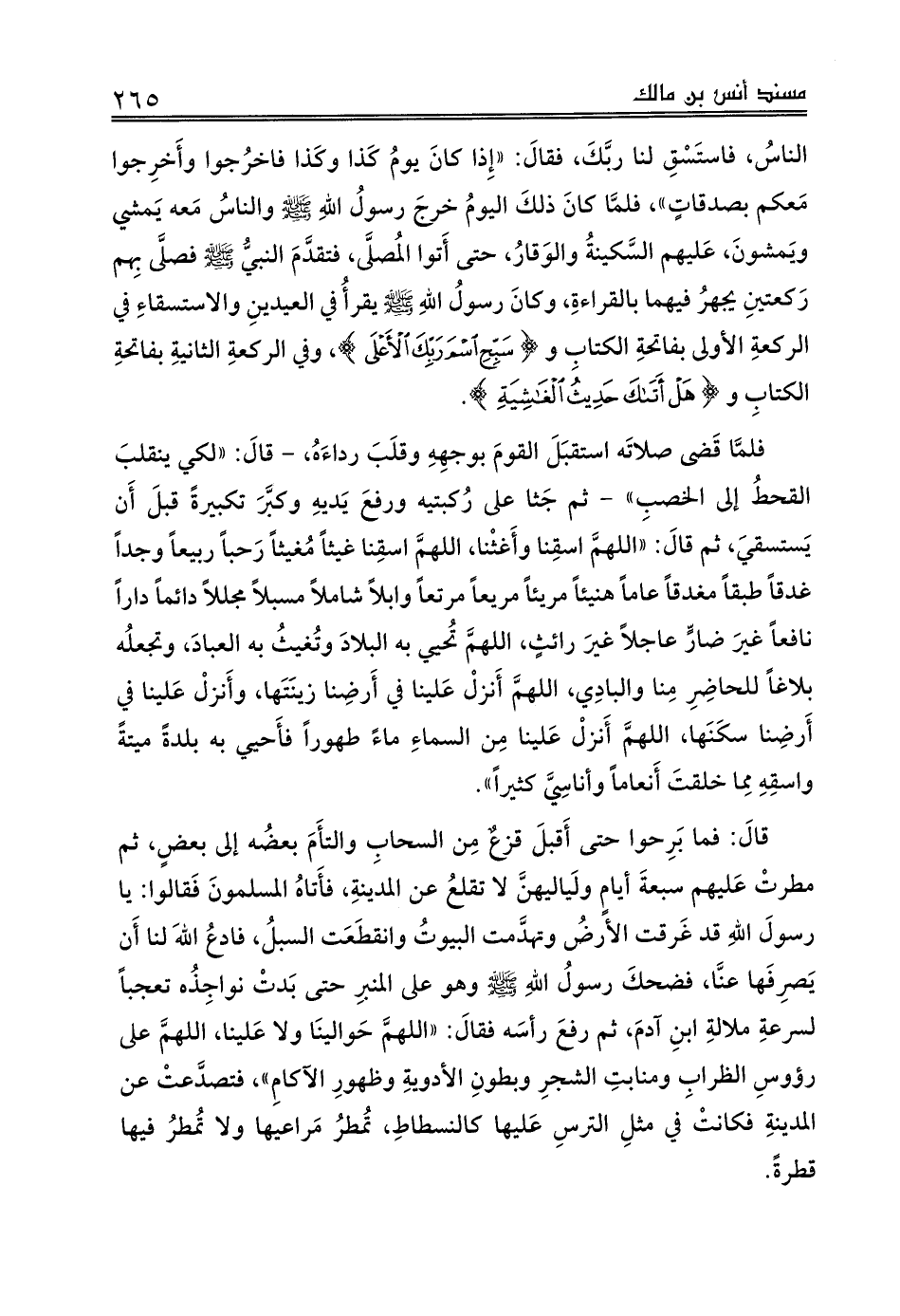 وأَسنَت الناسُ، فاستَسْقِ لنا ربَّكَ، فقالَ: «إِذا كانَ يومُ كَذا وكَذا فاخرُجوا وأَخرِجوا مَعكم بصدقاتٍ»، فلمَّا كانَ ذلكَ اليومُ خرجَ رسولُ اللهِ صلى الله عليه وسلم والناسُ مَعه يَمشي ويَمشونَ، عَليهم السَّكينةُ والوَقارُ، حتى أَتوا المُصلَّى، فتقدَّمَ النبيُّ صلى الله عليه وسلم فصلَّى بِهم رَكعتينِ يجهرُ فيهما بالقراءةِ، وكانَ رسولُ اللهِ صلى الله عليه وسلم يقرأُ في العيدينِ والاستسقاءِ في الركعةِ الأولى بفاتحةِ الكتابِ و {سَبِّحِ اسْمَ رَبِّكَ الْأَعْلَى}، وفي الركعةِ الثانيةِ بفاتحةِ الكتابِ و {هَلْ أَتَاكَ حَدِيثُ الْغَاشِيَةِ}،