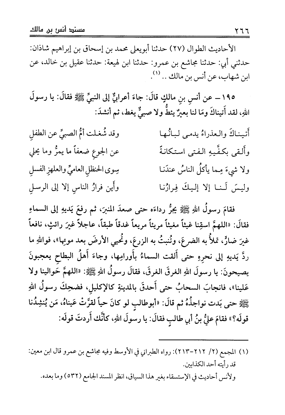(¬1) المجمع (2/ 212 - 213): رواه الطبراني في الأوسط وفيه مجاشع بن عمرو قال ابن معين: قد رأيته أحد الكذابين. ولأنس أحاديث في الإستسقاء بغير هذا السياق، انظر المسند الجامع (532) وما بعده.