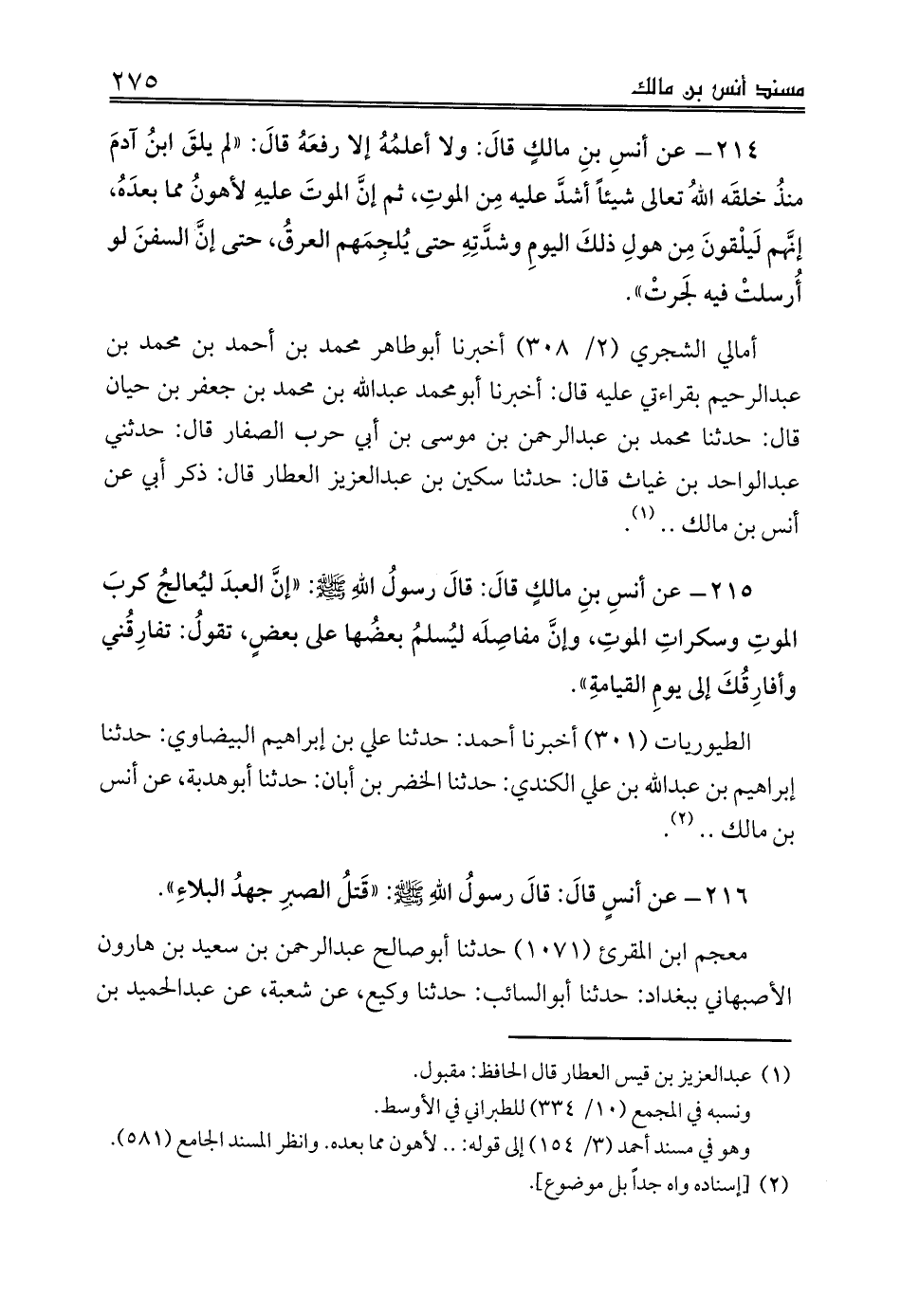 216 - عن أنسٍ قالَ: قالَ رسولُ اللهِ صلى الله عليه وسلم: «قَتلُ الصبرِ جهدُ البلاءِ».