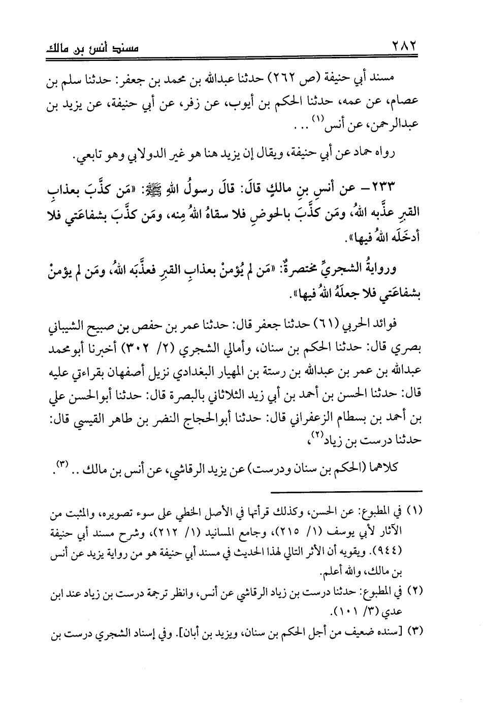 مسند أبي حنيفة (ص 262) حدثنا عبدالله بن محمد بن جعفر: حدثنا سلم بن عصام، عن عمه، حدثنا الحكم بن أيوب، عن زفر، عن أبي حنيفة، عن يزيد بن عبدالرحمن، عن أنس (¬1) .. .