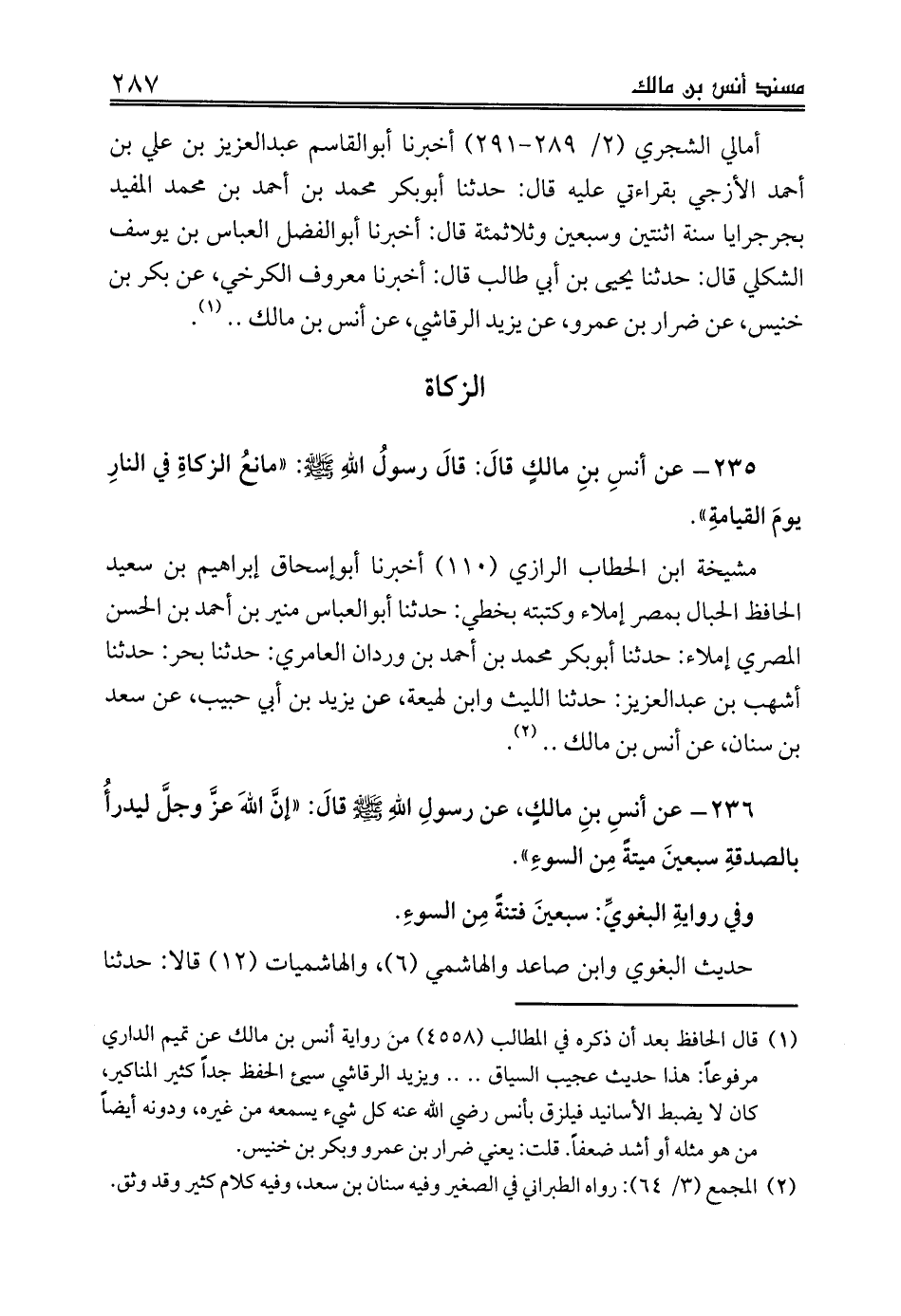 235 - عن أنسِ بنِ مالكٍ قالَ: قالَ رسولُ اللهِ صلى الله عليه وسلم: «مانعُ الزكاةِ في النارِ يومَ القيامةِ».