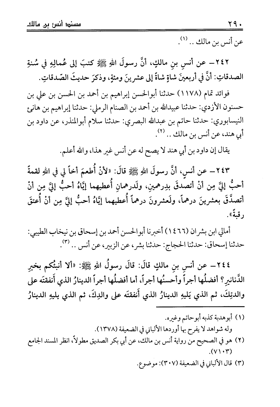 242 - عن أنسِ بنِ مالكٍ، أنَّ رسولَ اللهِ صلى الله عليه وسلم كتبَ إلى عُمالِهِ في سُنةِ الصدقاتِ: أنَّ في أربعينَ شاةٍ شاةً إلى عشرينَ ومئةٍ، وذكرَ حديثَ الصّدقاتِ.