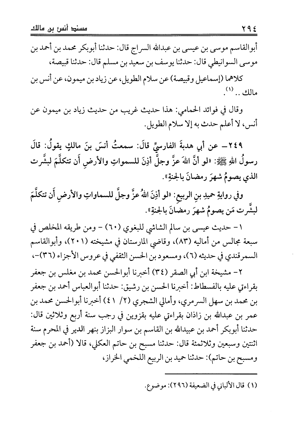 249 - عن أبي هدبةَ الفارسيِّ قالَ: سمعتُ أنسَ بنَ مالكٍ يقولُ: قالَ رسولُ اللهِ صلى الله عليه وسلم: «لو أنَّ اللهَ عزَّ وجلَّ أذِنَ للسمواتِ والأرضِ أَن تتكلَّمَ لبشَّرت الذي يصومُ شهرَ رمضانَ بالجنةِ».