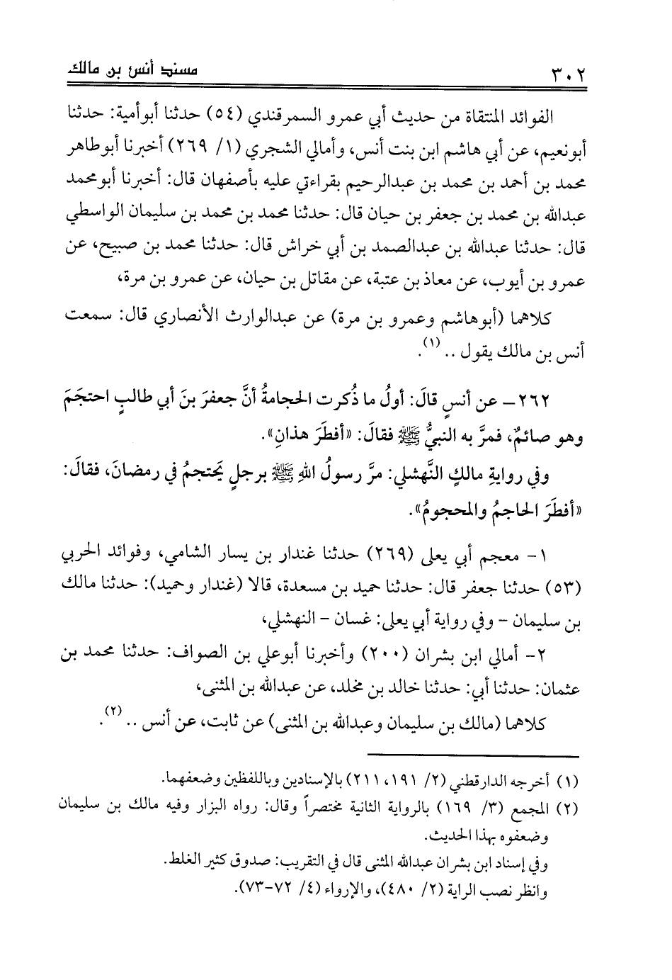 262 - عن أنسٍ قالَ: أولُ ما ذُكرت الحجامةُ أنَّ جعفرَ بنَ أبي طالبٍ احتجَمَ وهو صائمٌ، فمرَّ به النبيُّ صلى الله عليه وسلم فقالَ: «أفطَرَ هذانِ».