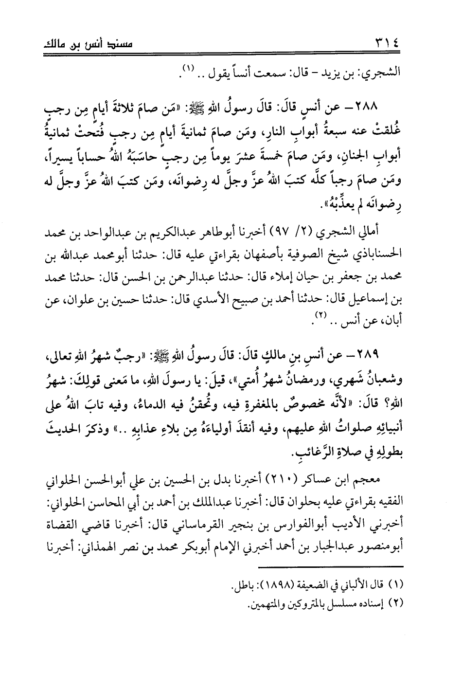 289 - عن أنسِ بنِ مالكٍ قالَ: قالَ رسولُ اللهِ صلى الله عليه وسلم: «رجبٌ شهرُ اللهِ تعالى، وشعبانُ شَهري، ورمضانُ شهرُ أُمتي»، قيلَ: يا رسولَ اللهِ، ما مَعنى قولِكَ: شهرُ اللهِ؟ قالَ: «لأنَّه مخصوصٌ بالمغفرةِ فيه، وتُحقنُ فيه الدماءُ، وفيه تابَ اللهُ على أنبيائِهِ صلواتُ اللهِ عليهم، وفيه أنقذَ أولياءَهُ مِن بلاءِ عذابِهِ .. » وذكرَ الحديثَ بطولِهِ في صلاةِ الرَّغائبِ.