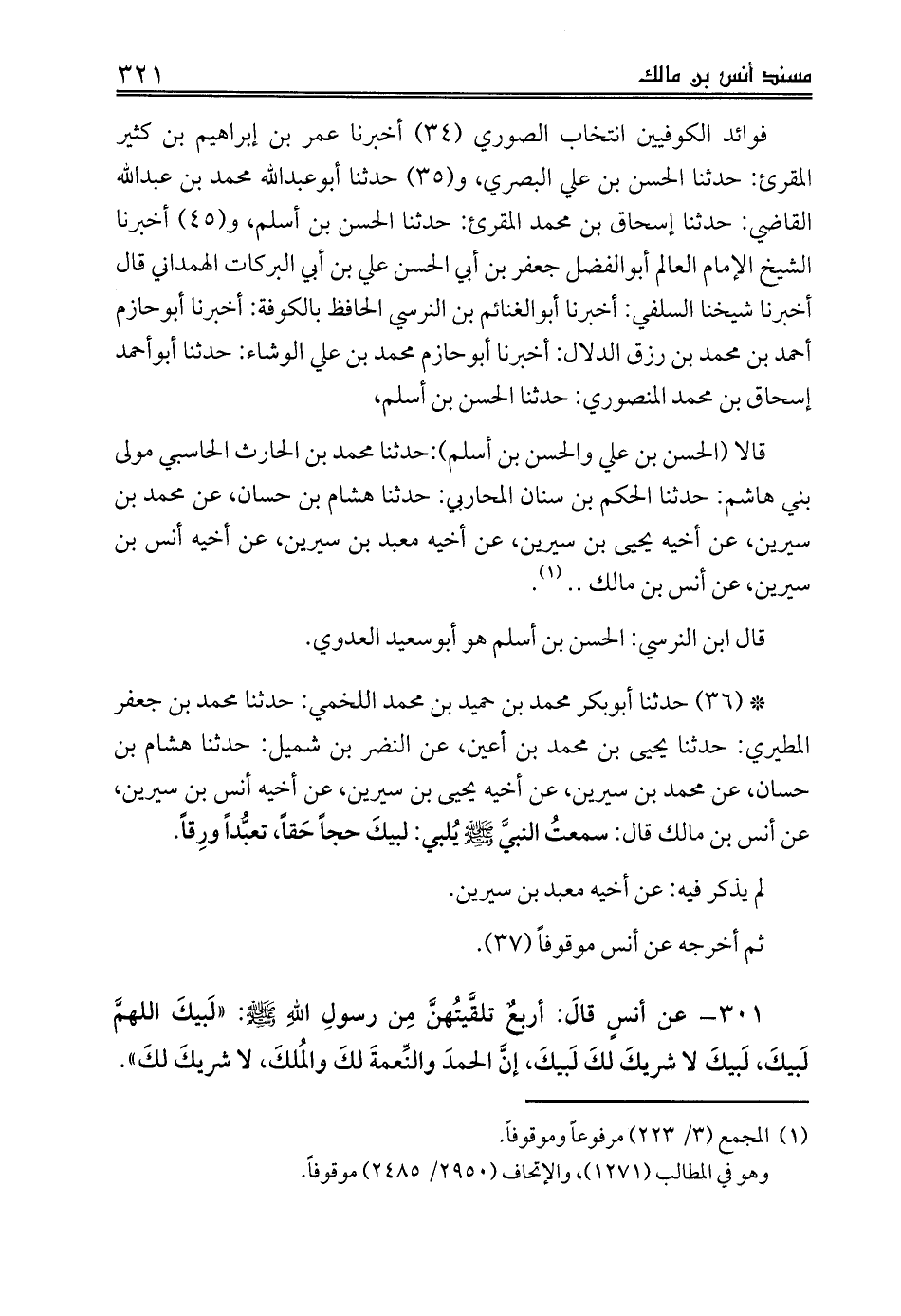 301 - عن أنسٍ قالَ: أربعٌ تلقَّيتُهنَّ مِن رسولِ اللهِ صلى الله عليه وسلم: «لَبيكَ اللهمَّ لَبيكَ، لَبيكَ لا شريكَ لكَ لَبيكَ، إنَّ الحمدَ والنِّعمةَ لكَ والمُلكَ، لا شريكَ لكَ».